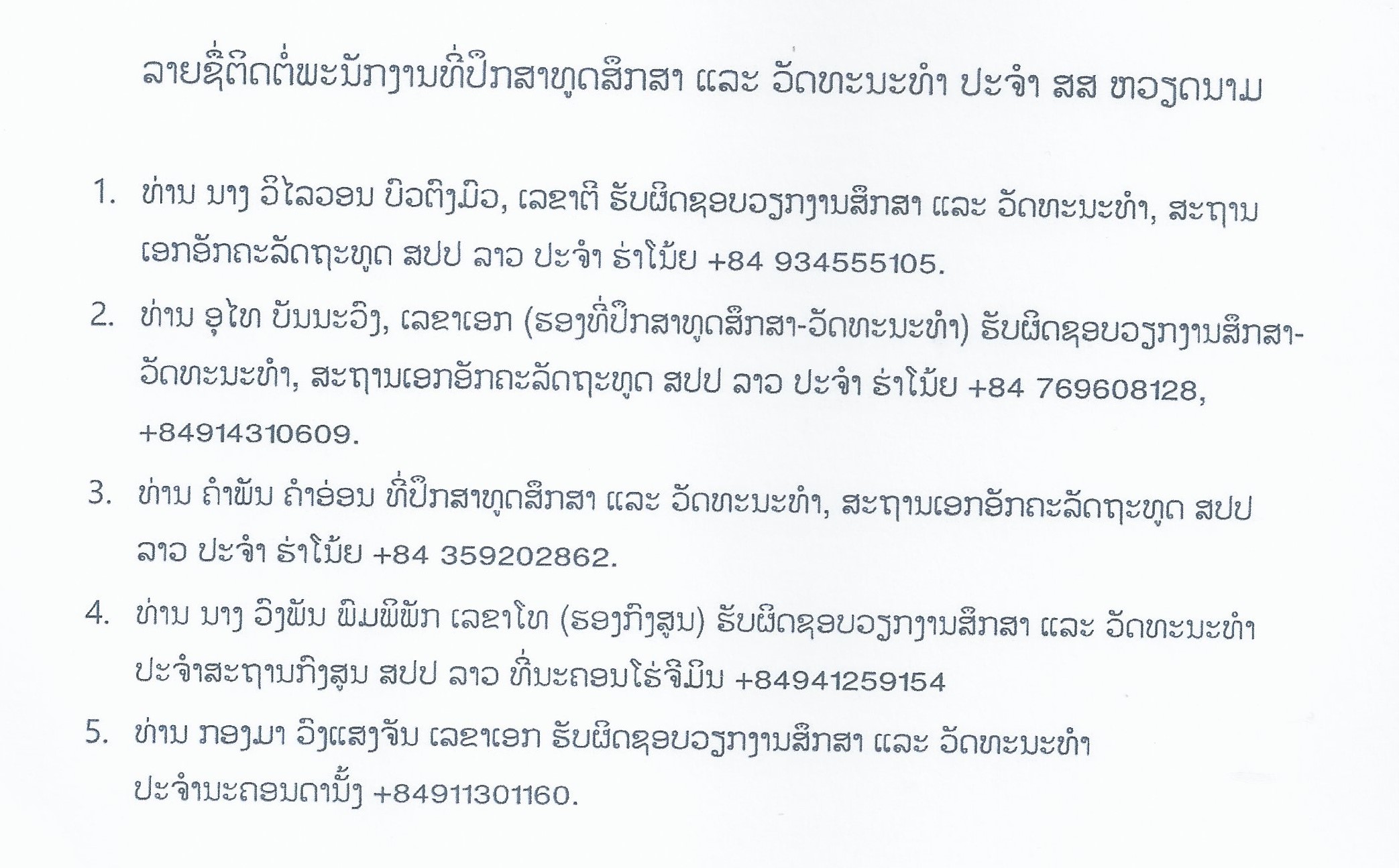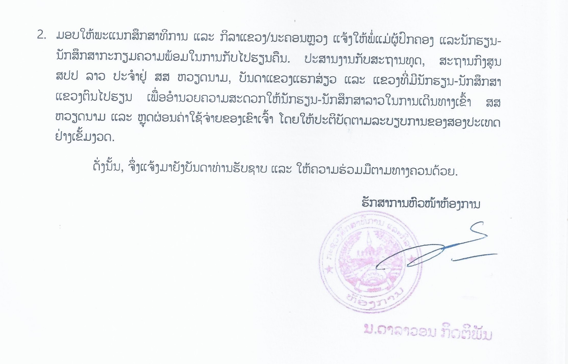 ເລື່ອງ ກັບຄືນໄປຮຽນຂອງນັກສຶກສາລາວ ຢູ່ ສສ ຫວຽດນາມ ທີ່ໄດ້ມາພັກຊົ່ວຄາວ ຢູ່ ສປປ ລາວ ໃນໄລຍະການລະບາດຂອງພະຍາດ Covid - 19 Written by Super User. Posted in ແຈ້ງການດ່ວນ Print Prev